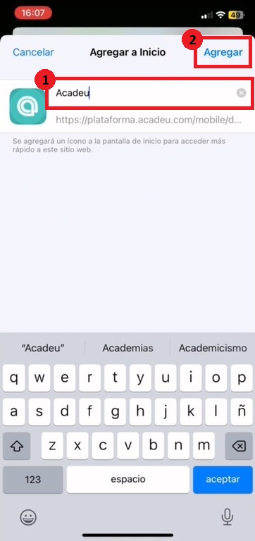 Configurá como nombre de la aplicación "Acadeu" y presioná la opción "Agregar"